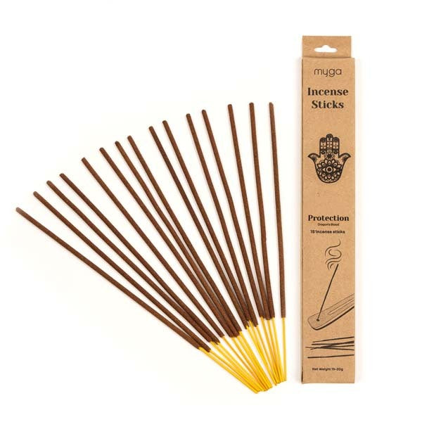 a package contains 15 sticks and can be used in yoga meditation or as a natural room fragrance a stick can be lit several times depending how strong you prefer the aroma mygas range of incense sticks offer an exciting variety from traditional and oriental sandalwood and patchouli to spicy cinnamon warm and sweet vanilla to exotic florals and woody notes such as pine dragons blood the sweet floral scent can help connect with yourself during meditation or any spiritual prayer dragons blood helps protect and strengthen your aura from external negativity and is smoked for dissolving spiritual attachments features handmade in india natural product nontoxic vegan zero plastic without petrochemical additives for rituals cleansing home fragrance used in meditation and yoga clears negative energy creates a relaxing atmosphere highest quality ingredients to offer long lasting fragrance