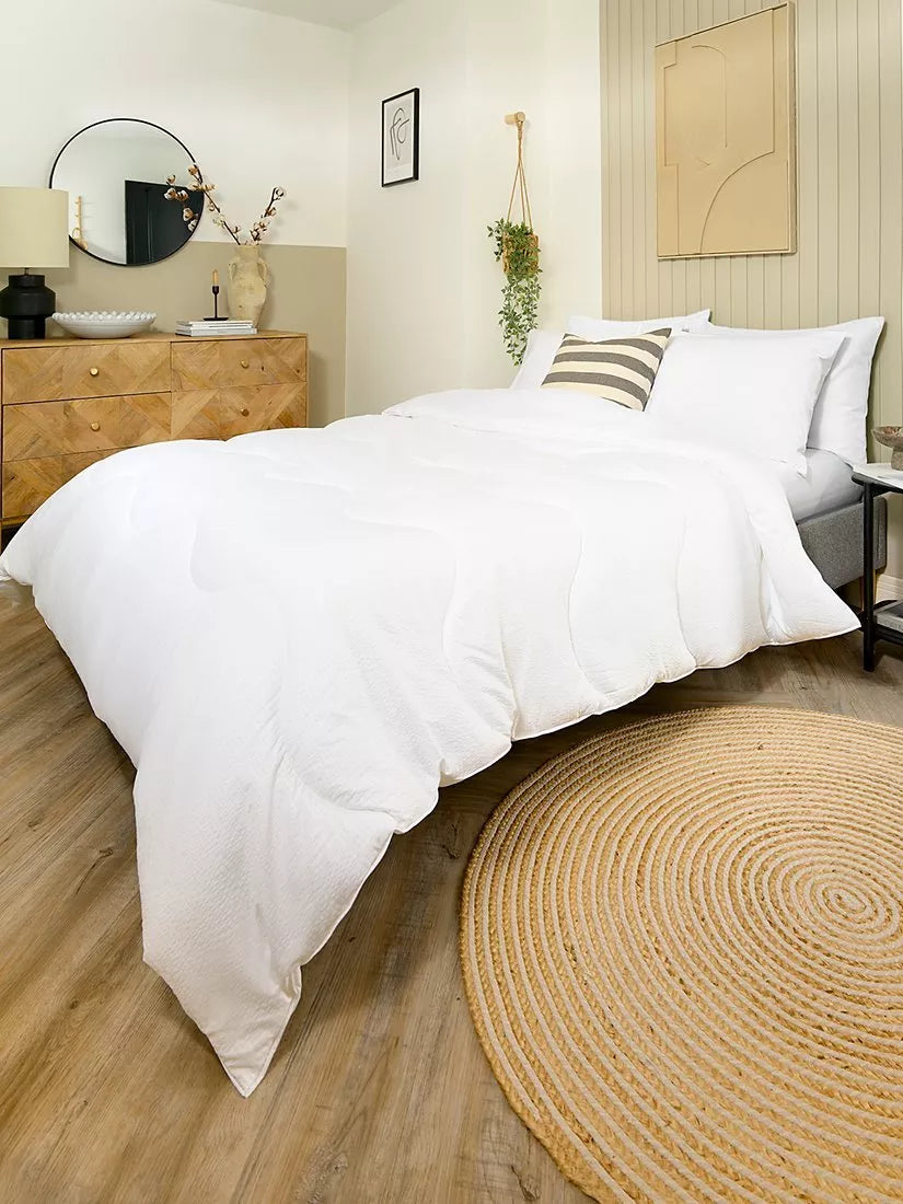 This hypoallergenic, light and airy coverless duvet cocoons in cloud-like comfort with its feather-light seersucker texture encasing both sides of the duvet. Filled and covered with silky, soft peachskin microfibre, wrap yourself up in dreamy comfort every night for an extra special slumber.