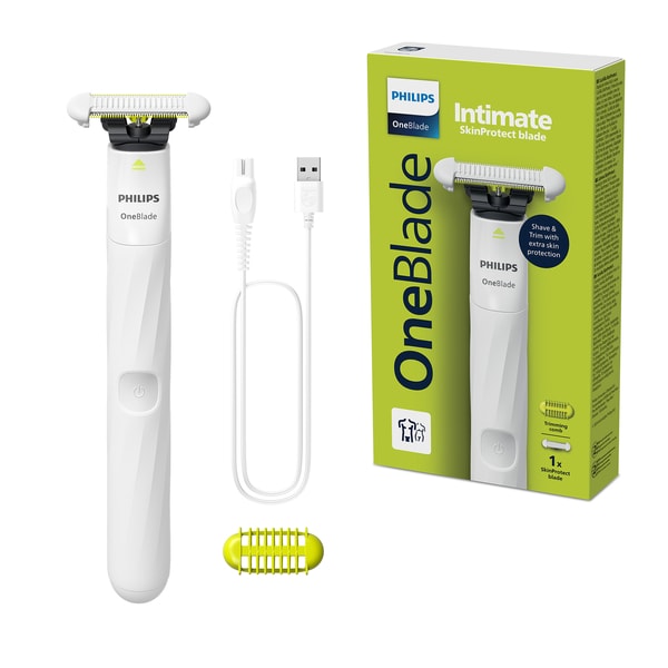 our skinprotect blade gives an extra layer of protection from nicks and cuts for sensitive armpit and intimate skin want to leave a little hair trim away your intimate and armpit hair anyway you want by clicking on the 3mm trimming comb the dualsided blade allows you to shave in both directions to easily reach those tricky spots create clean lines or add an extra touch of styling oneblade intimate shaver is fully waterproof so feel free to shave however way you prefer whats included oneblade handle 1x skinprotect blade 1x trimming comb usba charging cable plug not included online survey of 15040 men electric grooming users conducted in 2022