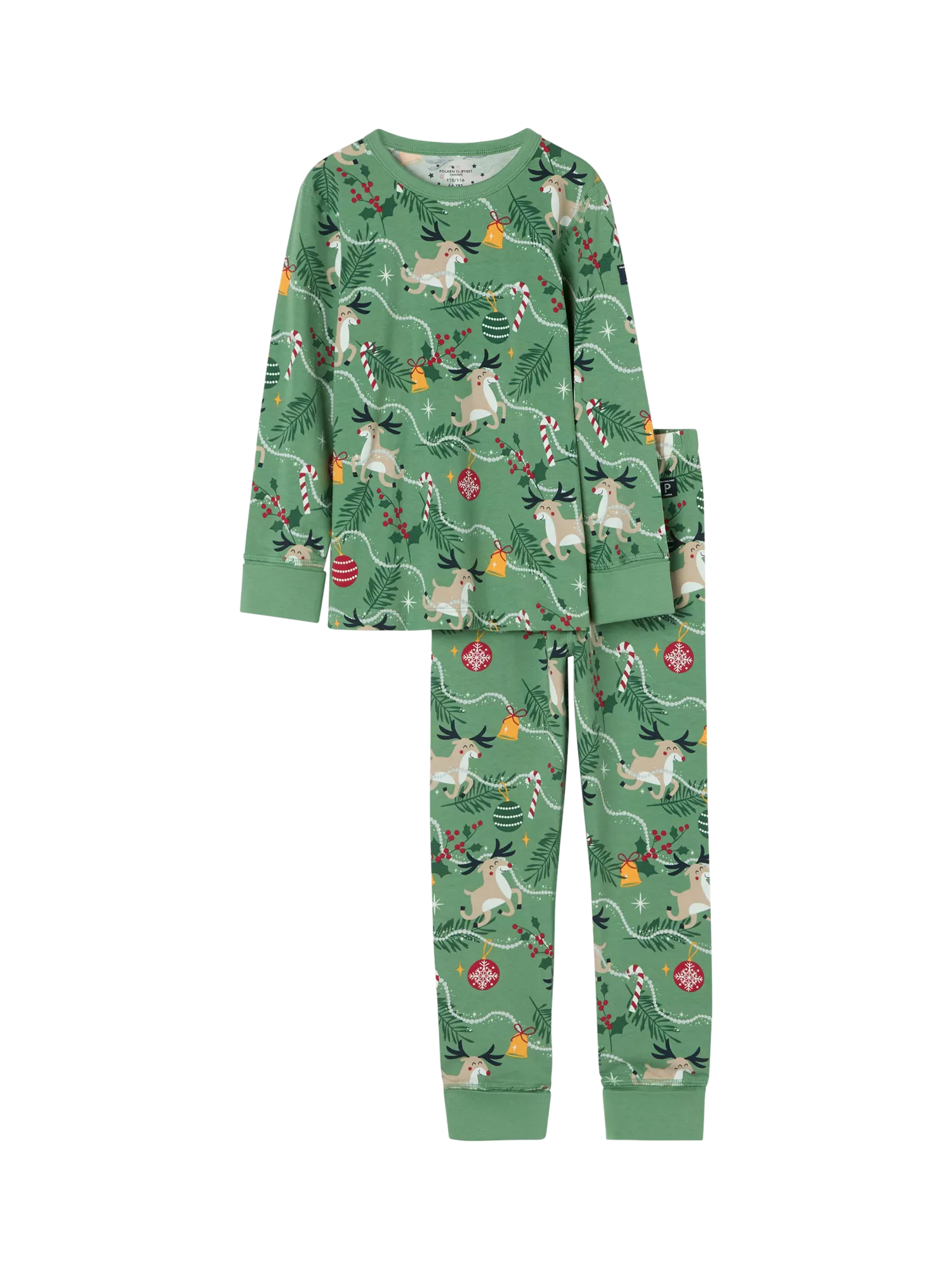 Sweet dreams are guaranteed in these soft organic cotton pyjamas. The long sleeve top has a seasonal Nordic winter wonderland print and comfy crew neck while the matching bottoms have an elasticated waistband for a comfortable fit. Finished with cuffs that can fold up or down so they can enjoy wearing them for longer.