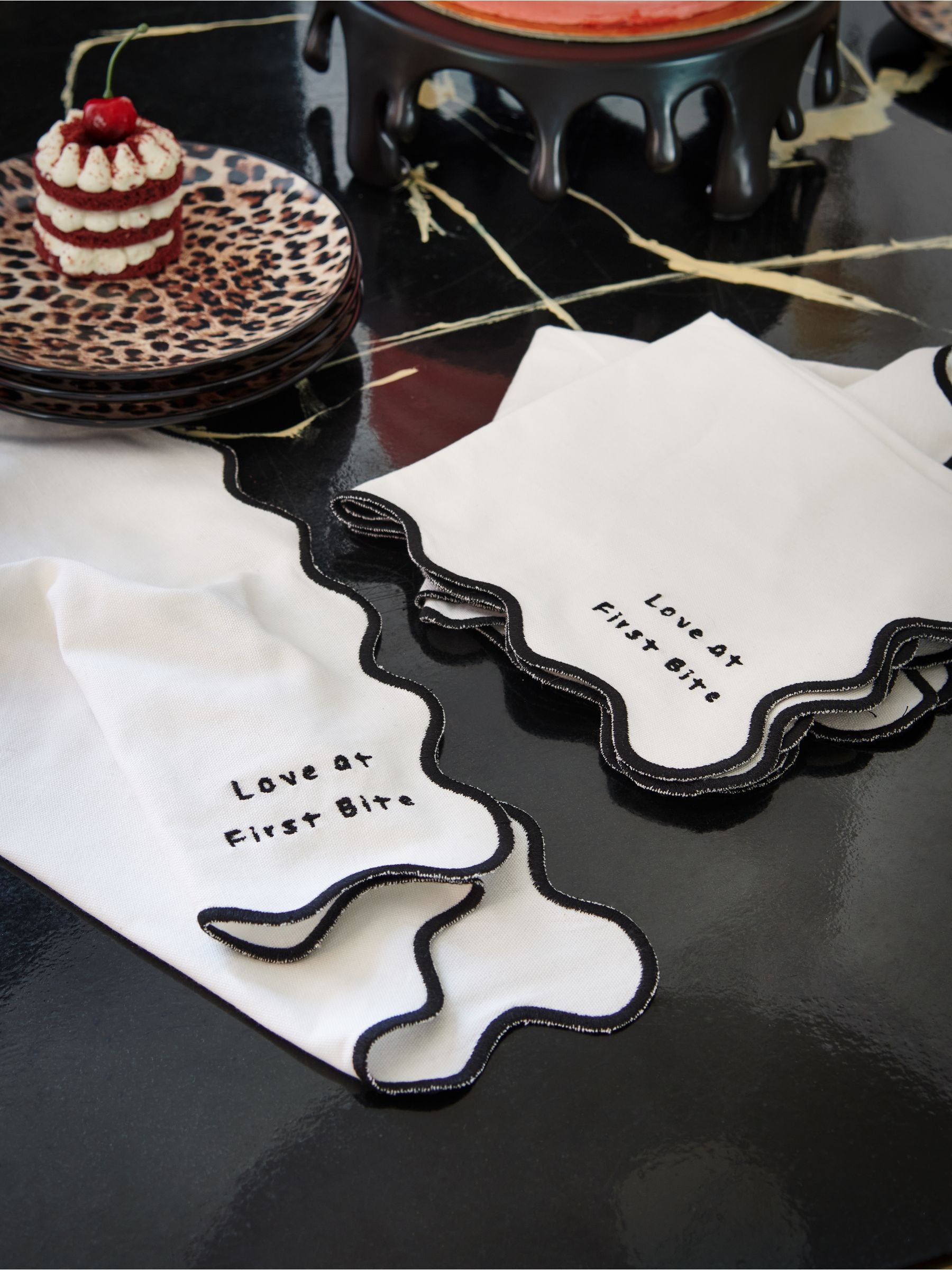 Add these quirky Rockett St George First Bite Napkins to your tablescape for a fun and flirty finish. Made from pure cotton with scalloped edges and embroidered slogan.