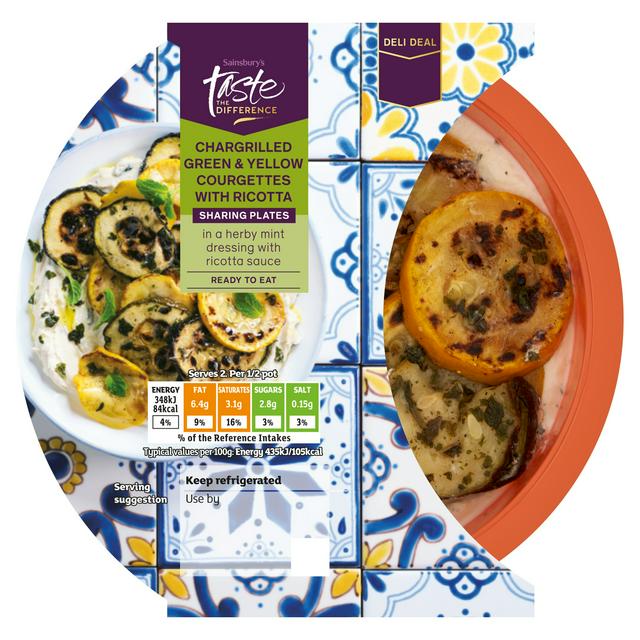 Product details Description Pickled and marinated, chargrilled courgettes with a ricotta, yoghurt and full fat whey cheese sauce in a herby mint dressing with ricotta sauce Quick nutrition guide Serves 2. Per 1/2 pot Typical Values Energy 348kJ 84kcal 4% Fat 6.4g Medium 9% Saturates 3.1g Medium 16% Sugars 2.8g...