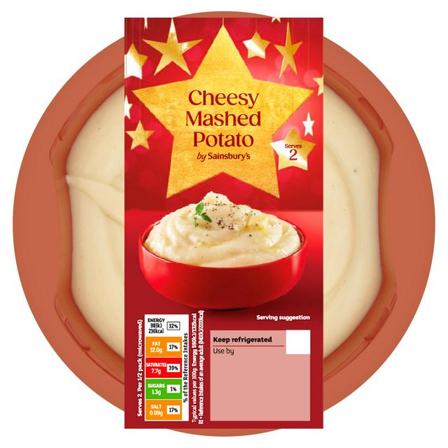 Product details Description British mashed potato with extra mature Cheddar cheese With extra mature Cheddar cheese Quick nutrition guide Serves 2. Per 1/2 pack (microwaved) Typical Values Energy 985kJ 236kcal 12% Fat 12.0g Medium 17% Saturates 7.7g High 39% Sugars 1.3g Low 1% Salt 0.99g Medium 17% of your reference...