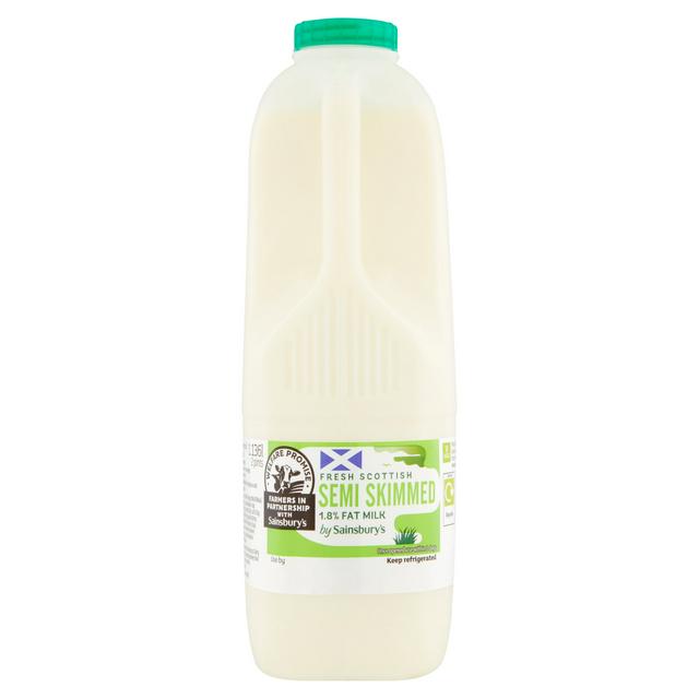 Product details Description Pasteurised homogenised semi-skimmed milk 1.8% Fat Milk by Sainsbury's We source 97% of our milk from the Sainsbury's Dairy Development Group (SDDG). Supporting farmers that adhere to our specific welfare standards. www.sainsburys.co.uk/milk Quick nutrition guide 200ml serving Typical Values Energy 419kJ 100kcal 5% Fat 3.6g Medium 5%...