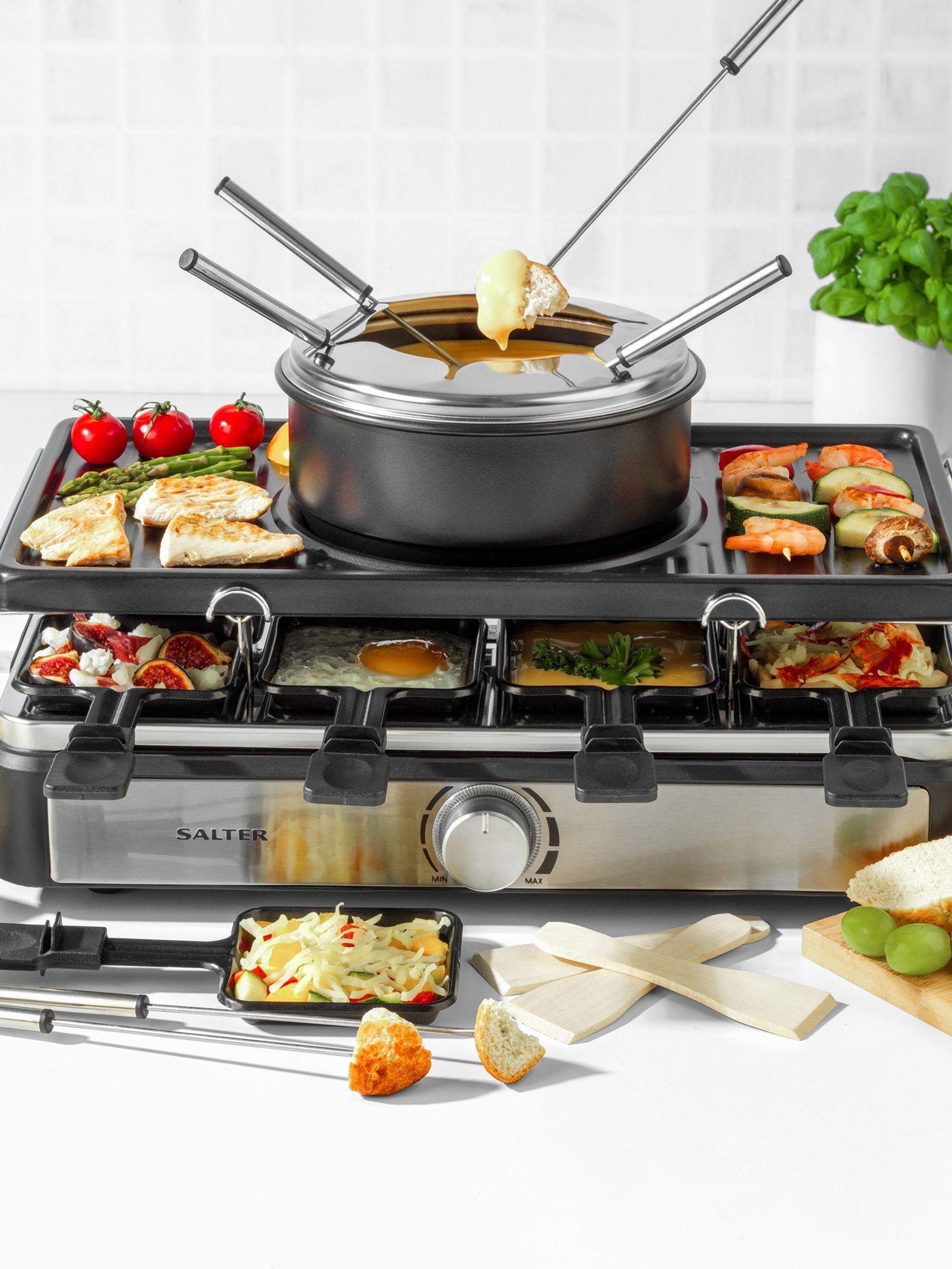 A perfect dinner party centrepiece, this Salter 2 in 1 Raclette Grill & Fondue Set makes hosting simple. With eight grill pans and wooden spatulas, melt cheese until bubbling, then serve over food cooked on the grill top. For a savoury meal, fill the fondue with broth to cook thin slices of meat or vegetables and serve alongside warm bread with cheese from the grill. Alternatively, have guests enjoy cheesy delicacies to begin, then end the meal with a chocolate fondue for dipping sweet treats.