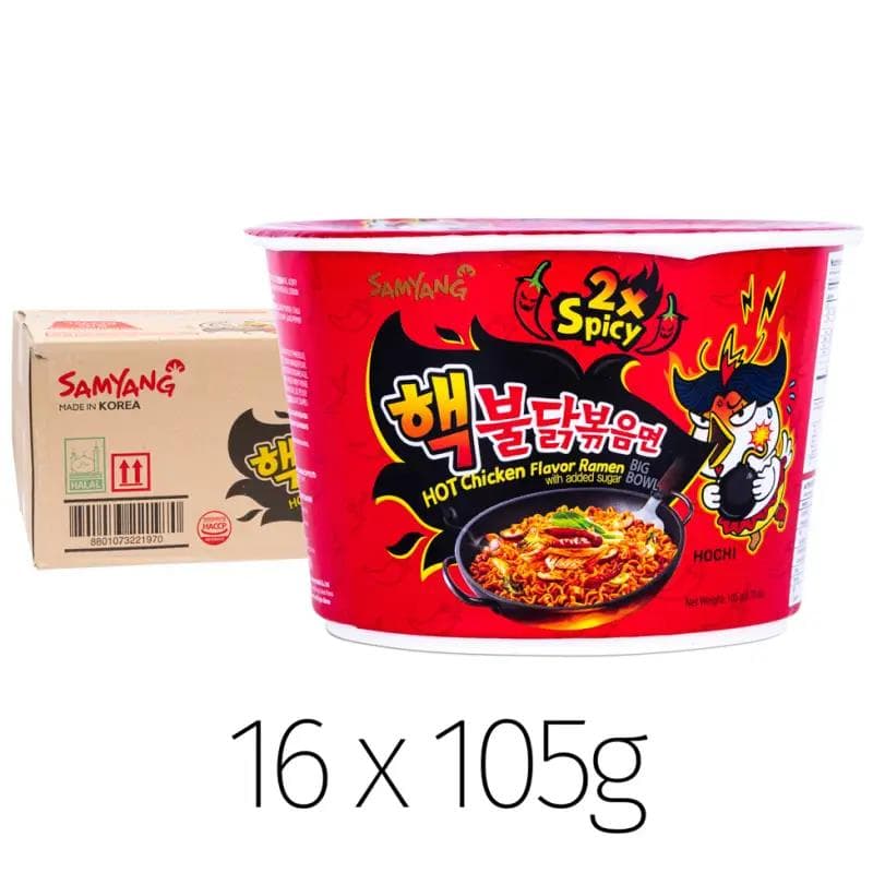 Experience a fiery feast with Samyang Hot Chicken Flavour Ramen Big Bowl (2x Spicy). This generous bowl of instant ramen takes the already intense heat of the original Buldak flavour and doubles it for an extra spicy kick. The chewy noodles are bathed in the signature spicy sauce, creating a bold and tantalising flavour profile. Perfect for those who love a serious heat challenge, this big bowl is a quick and satisfying way to enjoy the distinctive taste of Samyang's 2x Spicy ramen.
