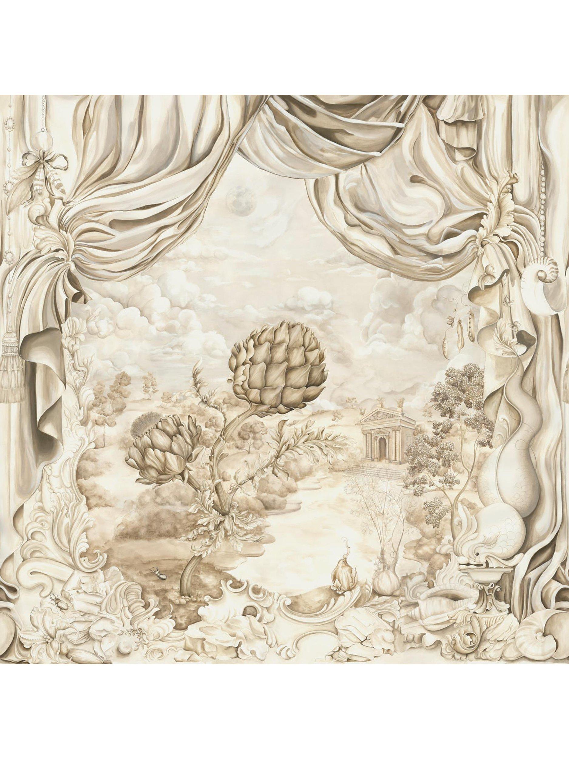 A single colourway in Alabaster gives way to the decadence of this design, where rococo dolphins, giant artichokes, fennel, garlic bulbs and mollusc shells meet architectural detailing in a Baroque style.