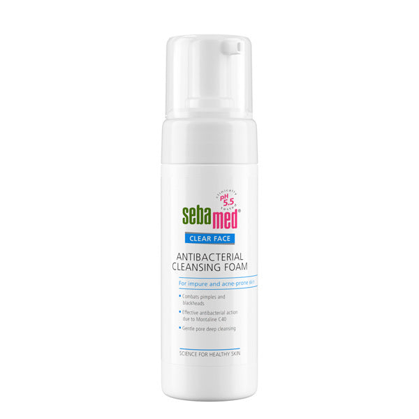 sebamed clear face antibacterial cleansing foam effectively penetrates the pores for mild poredeep cleansing it protects against skin barrier damage during cleansing leaving skin smooth and hydrated for use on wet or dry skin its ph 55 value of healthy skin supports and protects the natural barrier function of the skins acid mantle for impure and acneprone skin kills bacteria within 5 min can be used on wet or dry skin combats pimples and blackheads the ph 55 promotes the natural barrier function of the skins acid mantle panthenol helps to regenerate irritated or inflamed skin and makes it soft and supple noticeable improvement of the skin feeling of the complexion the antibacterial cleansing complex for impure and acneprone skin helps effectively to combat skin impurities the foams active ingredient montaline c40 combats bacteria and helps to prevent the formation of pimples and blackheads for all forms of acne with inflamed pimples