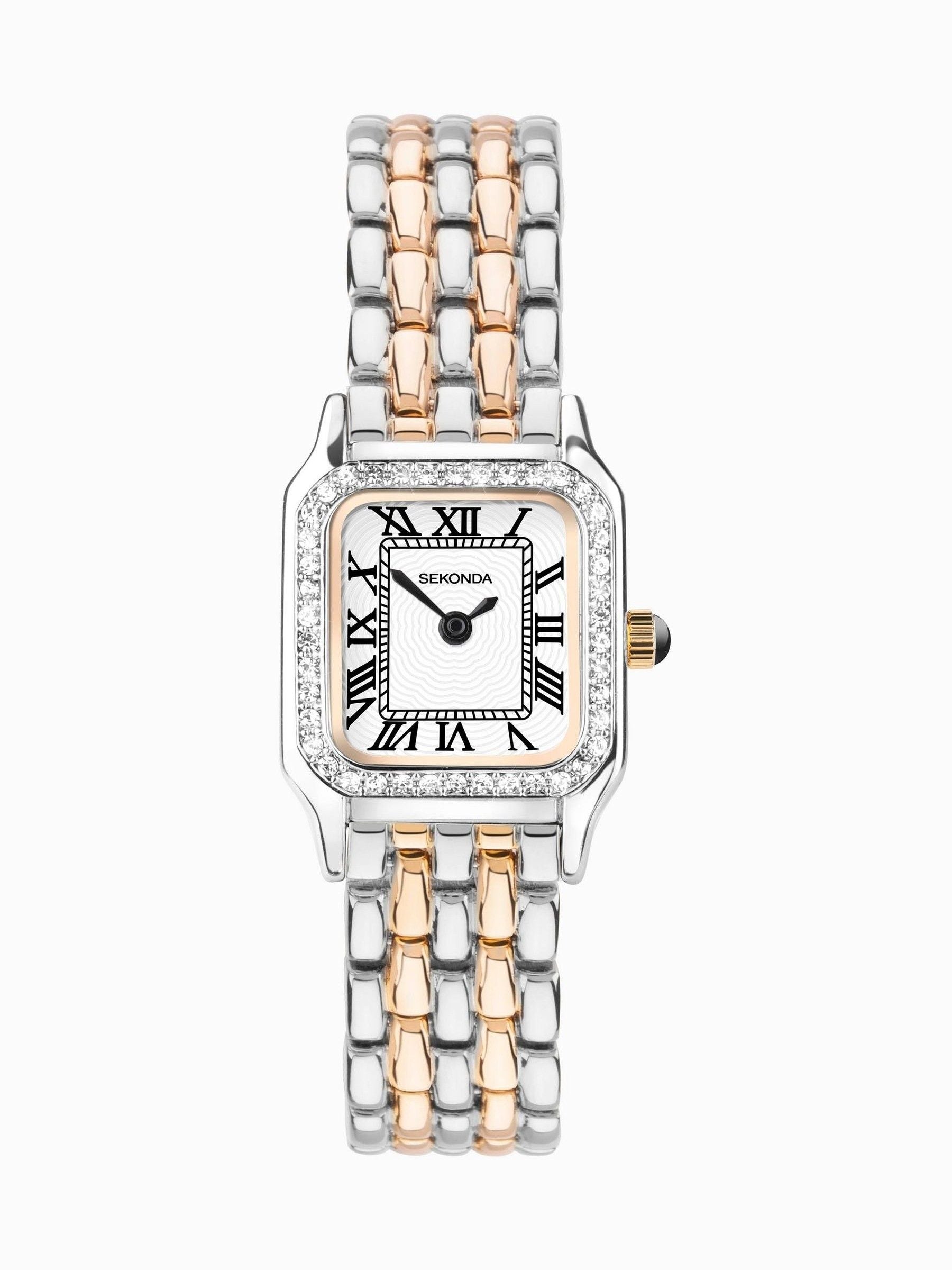 This watch fastens with a two tone, ion-plated rose gold and silver alloy bracelet. The watch has a rectangular, two tone alloy case with a stone set bezel housing a white dial.