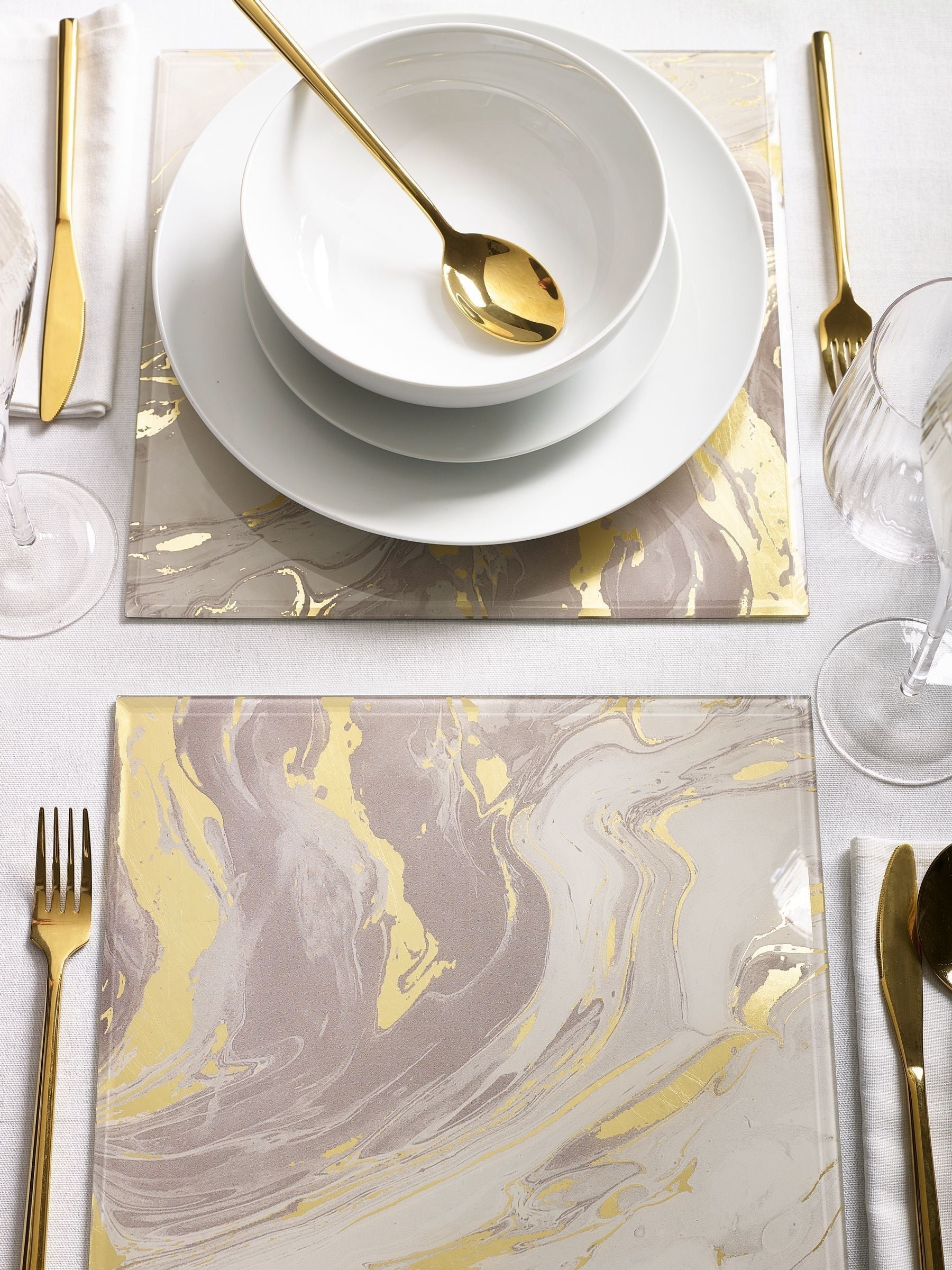 These stunning glass table settings add a touch of luxury to your dining space. Matching coasters available