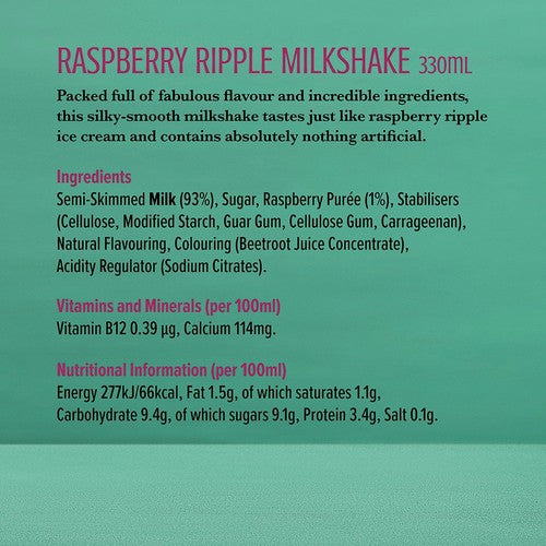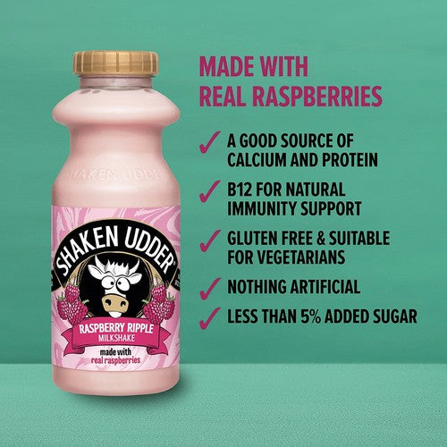 This silky-smooth Shaken Udder milkshake captures the fantastic flavour of raspberry ripple ice cream in a convenient ready-to-drink format. It is carefully crafted using quality ingredients to ensure a rich taste sensation for consumers. This beverage contains absolutely nothing artificial, appealing to those seeking cleaner labels in their chilled drinks.
