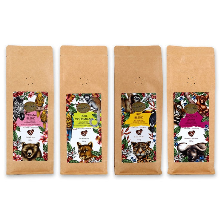 Smith's Coffee Company's Animal Range selection pack is an ideal gift for any coffee lover. The pack contains 4 x 227g packs, one single origin and three blends, which are all varying in strength and flavour and are suitable for filter or cafetiere coffee drinkers.