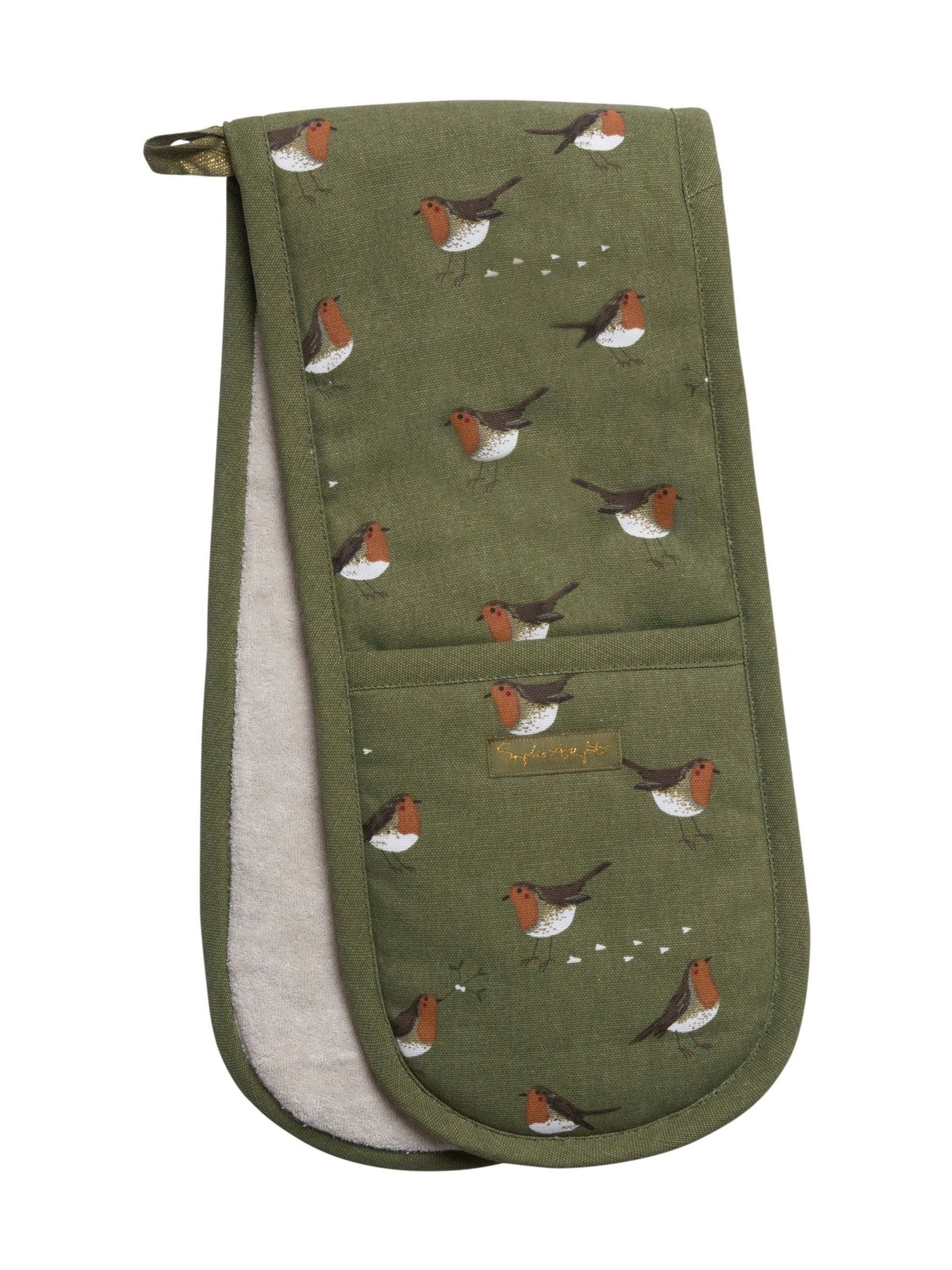 Bring festive cheer to your kitchen with this stylish double oven gloves, showcasing plump red-breasted robins walking through the snow. A lovely seasonal addition that’s both practical and decorative—perfect for serving up. Christmas lunch in style. L 84 x W 18cm. Made from 100% cotton. Polyester thermal layer. Hanging loop for easy storage Part of the Robin Collection.