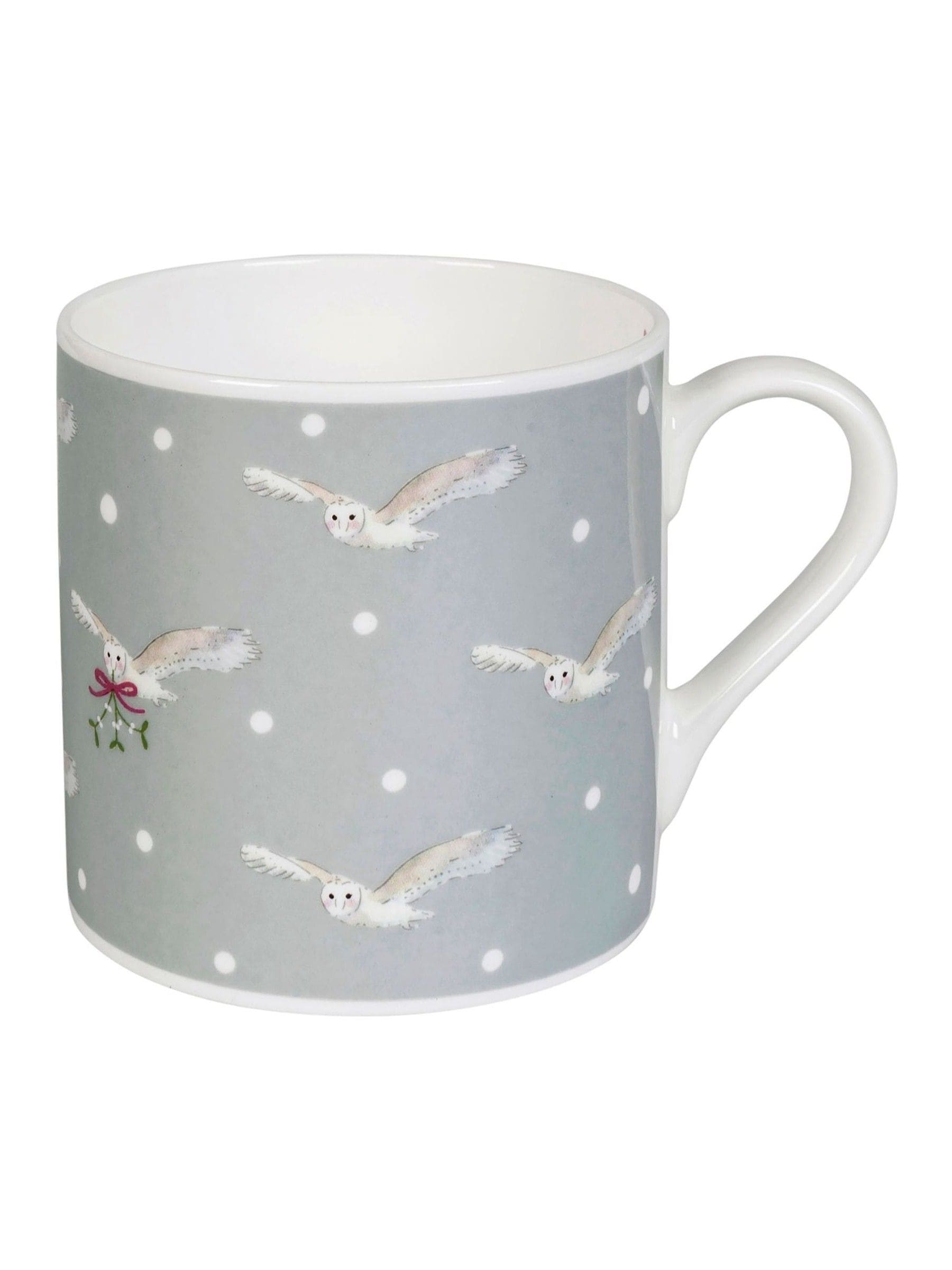 This winter-grey fine bone china mug features graceful barn owls in flight, with delicate white dots adding to the snowy effect. Some owls carry sprigs of mistletoe, making it a stylish yet subtle festive piece. A lovey mug for your morning Christmas coffee or afternoon tea. It makes a lovely festive gift idea. Large: 425ml (H 9 x W 12 x Dia. 9cm, including handle) Fine bone china Microwave and dishwasher safe Hand decorated and finished in the UK Gift boxed Matches the Night Owl collection