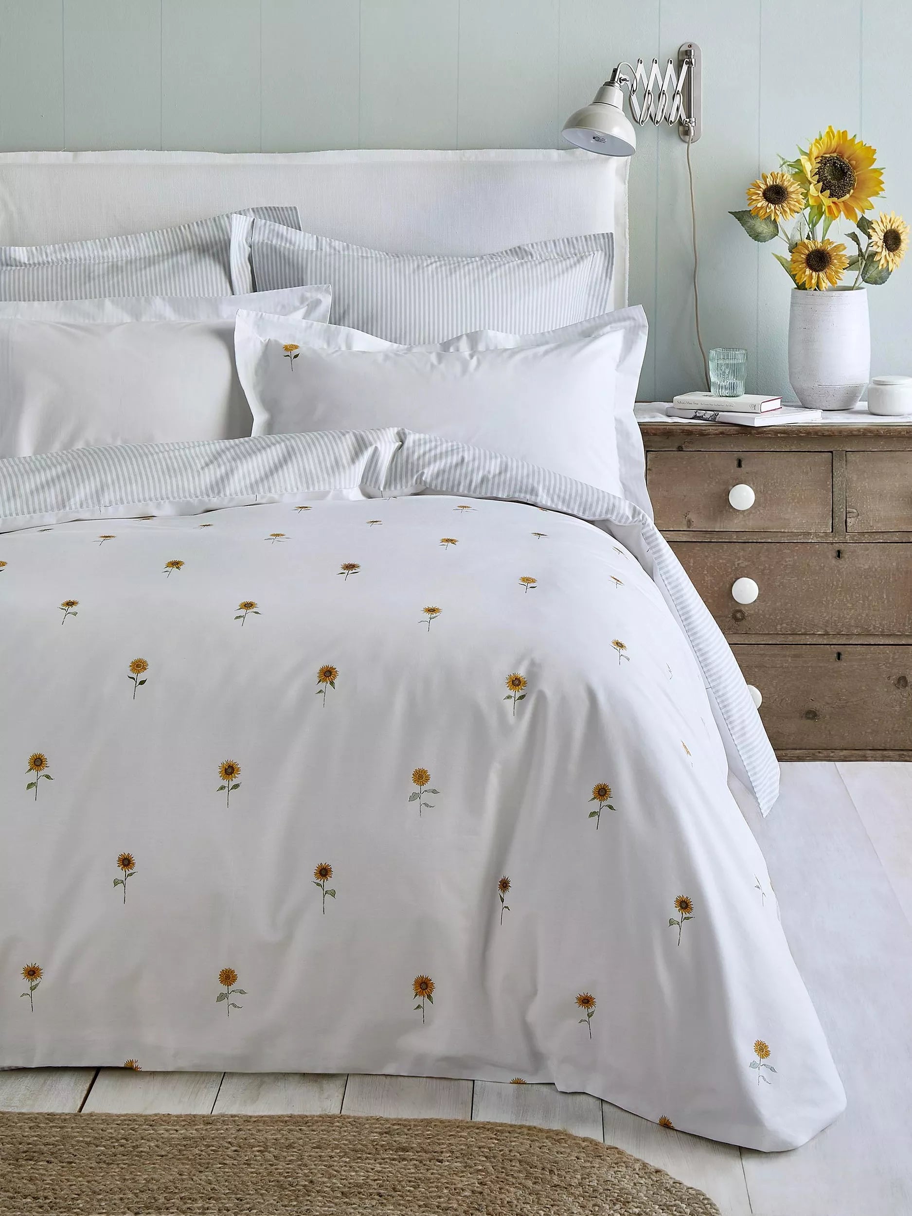 Dream of hazy, late summer days surrounded by beautiful sunflowers in delightful ochre yellow tones. This crisp white bed linen has a soft sage green pinstripe reverse and comes with Oxford edge pillowcases and corner sunflower detailing. It's made from 100% cotton with a 200-thread count.