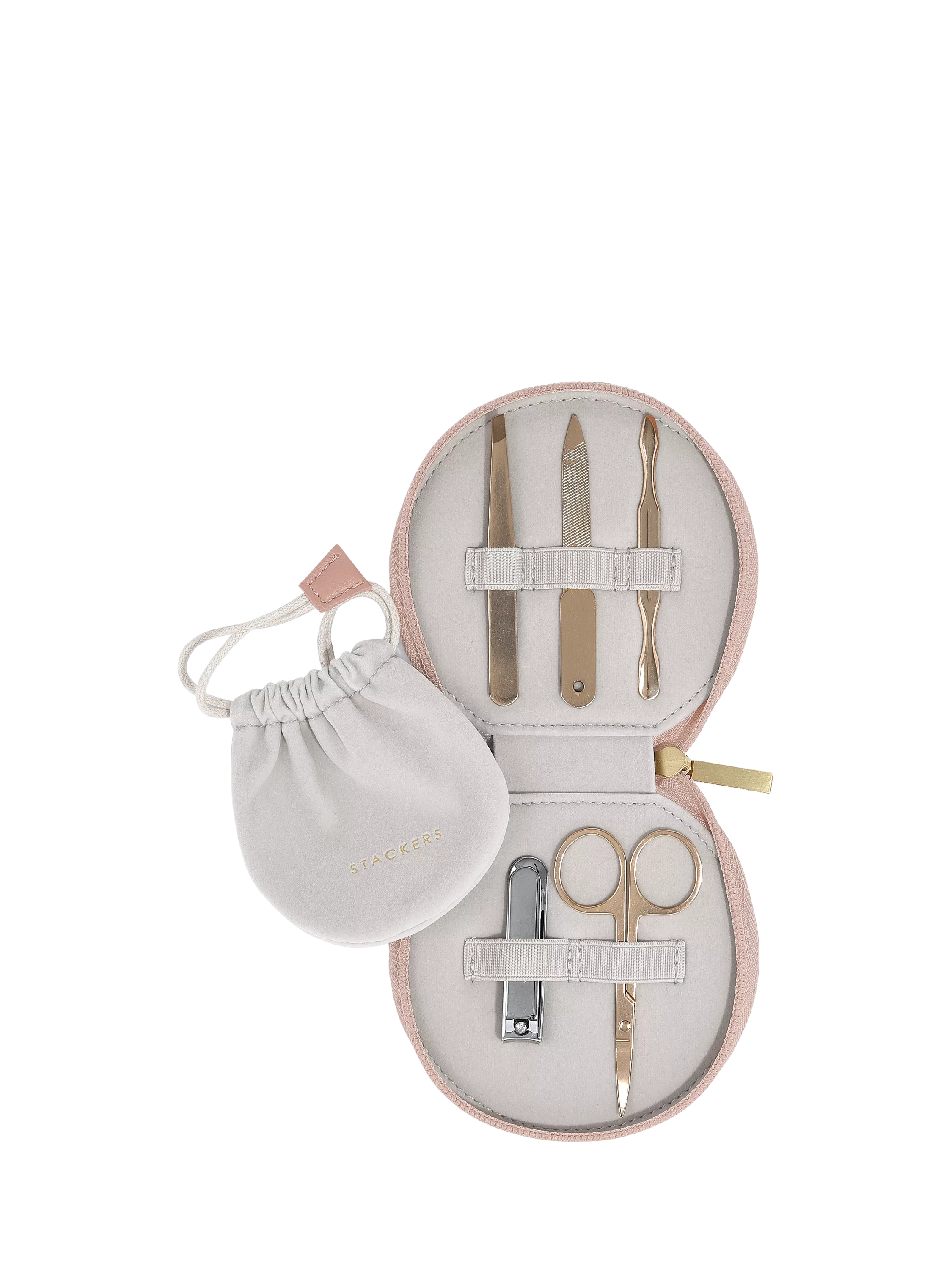 The Manicure Set contains all the essentials to keep your nails perfectly manicured on-the-go. The 5 piece set consists of scissors, nail clippers, tweezers, a cuticle pusher and nail file, as well as an additional separate draw-string pouch. The elasticated loops keep tools in place, whilst the velvet lining and faux-leather exterior give it a luxurious feel. The compact size and zip fastening make it a perfect beauty gift and is ideal for travel or keeping in a washbag or handbag.