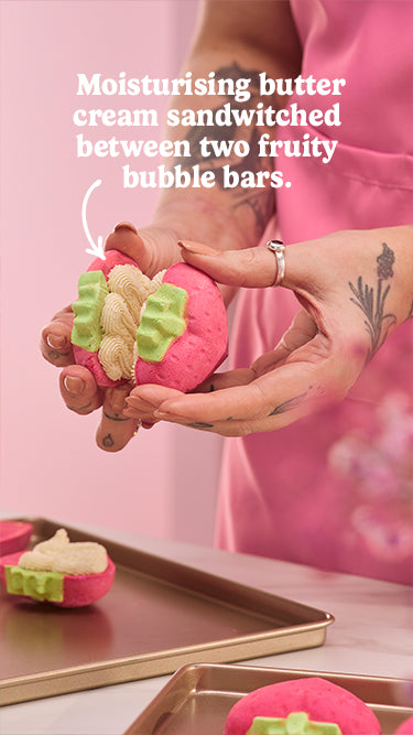 - Two fruity bubble bar halves are sandwiched together with a moisturising butter cream, perfect for imparting softness to your skin.