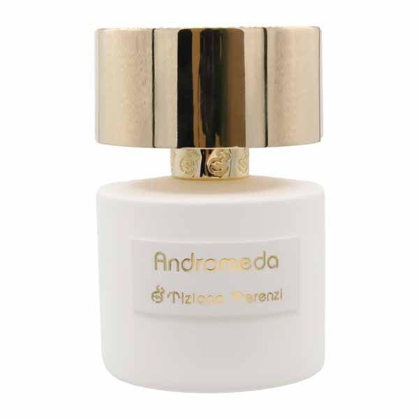 Tiziana Terenzi Andromeda is a luxurious 100ml Extrait De Parfum presented in an elegant vessel. This fragrance is housed in a distinctive white bottle featuring sophisticated gold accents and a highly textured cap. The visual presentation strongly suggests a refined and exclusive scent experience for the discerning wearer.