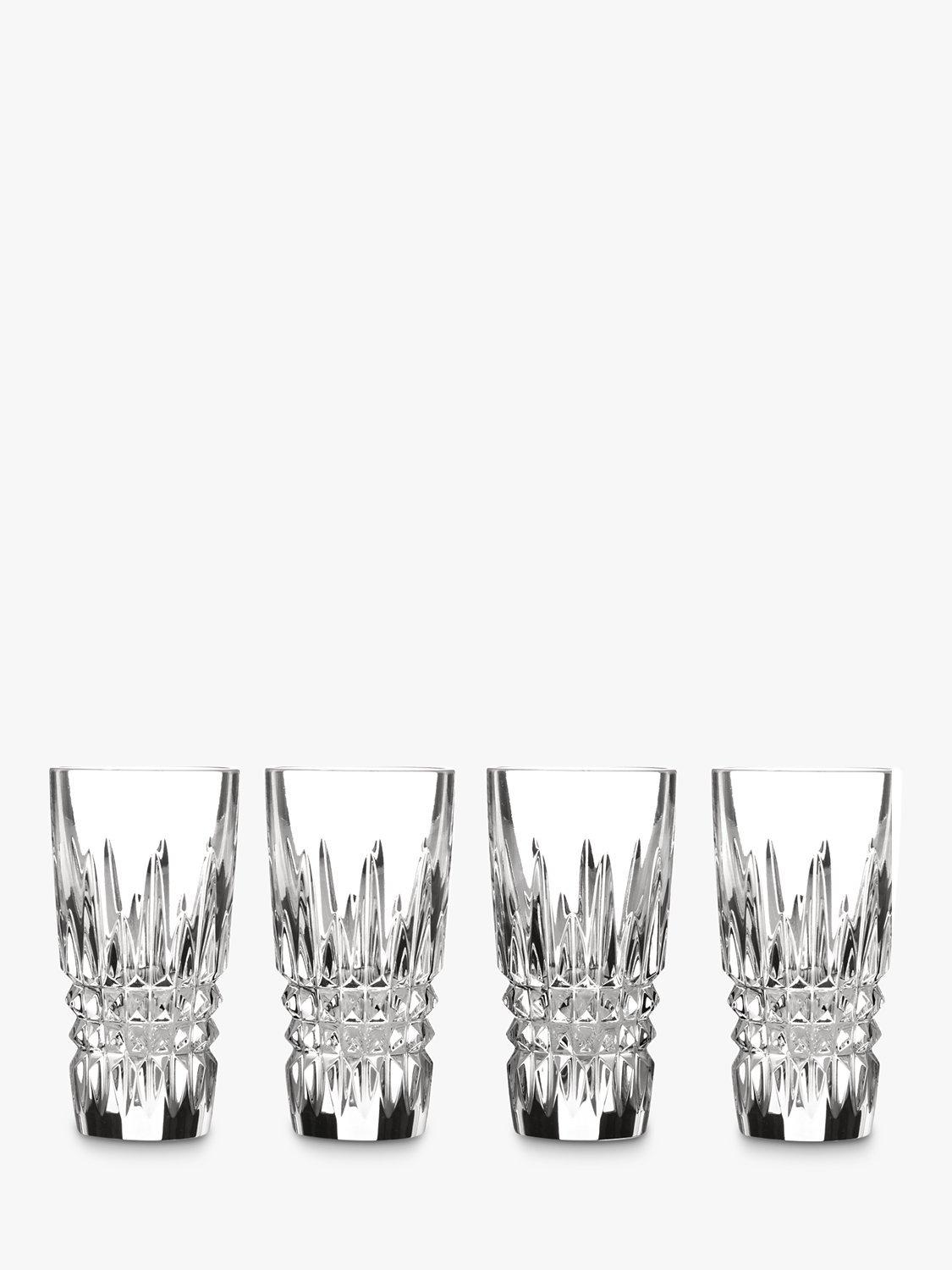 Waterford Crystal presents the Lismore Diamond Shot Glasses Set of four, a modern take on a classic design. These glasses feature intricate diamond cuts that beautifully catch and refract light, enhancing any serving. The radiant fine crystal ensures contents look exquisite. This set is ideal for refined entertaining and elegant presentation.