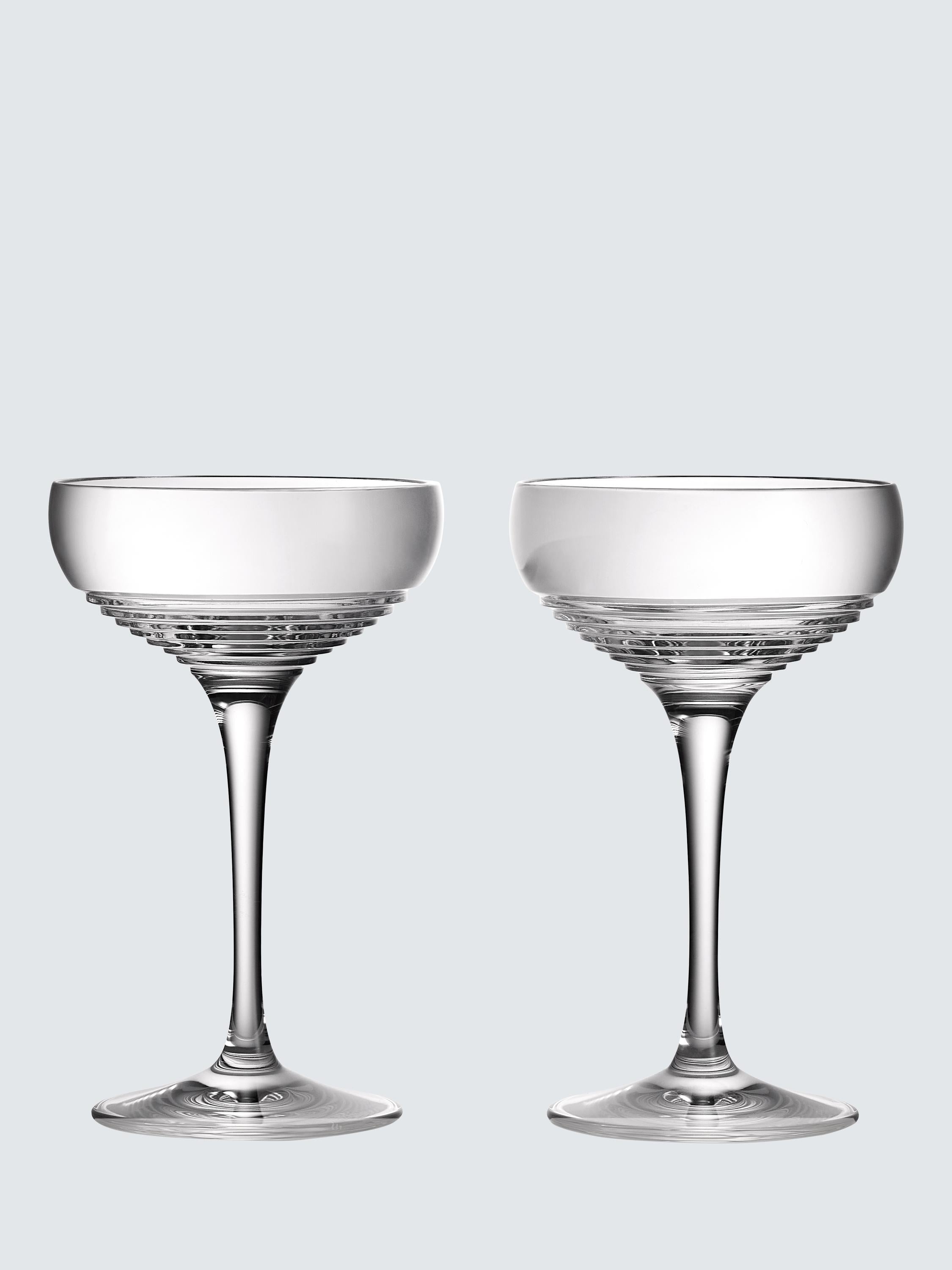 These two crystal coupe glasses are expertly crafted to enrich the taste and aroma of your favourite cocktails. Whether you're serving a classic Martini or a Champagne cocktail, each coupe glass will make your mixology experience truly luxurious. They feature the Circon cut glass pattern from Waterford. Presented in a Waterford gift box.