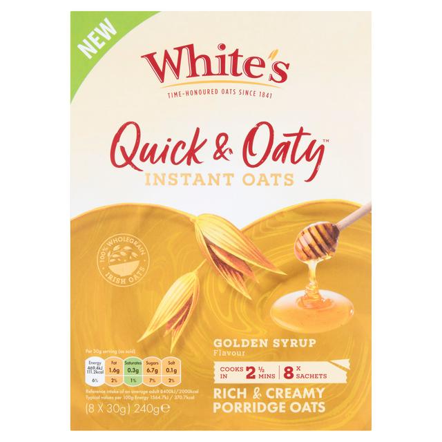 Whites Quick Oaty Instant Oats provide a convenient breakfast solution featuring a delicious golden syrup flavour. These eight sachets deliver a rich, creamy porridge experience. Crafted from 100% Wholegrain Irish Oats, they are ready in only two and a half minutes, offering high fibre content.