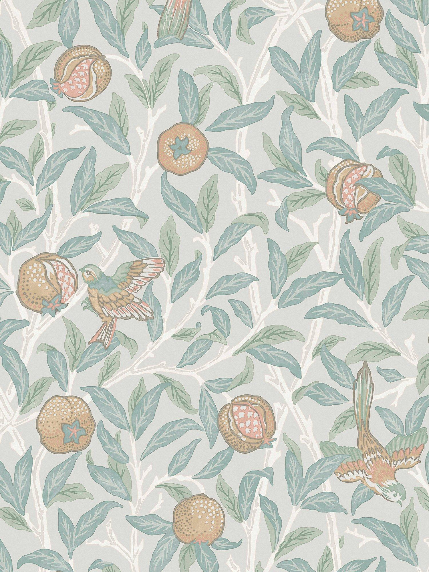 William Morris At Home Bird And Pomegranate Wallpaper in the Duck Egg shade 124261 revives classic nature themes. This dynamic pattern showcases perching and swooping birds amid lush foliage and abundant, ripe pomegranates. Inspired by Morris's earlier "Fruit" design, this vibrant wallpaper embodies his characteristic whimsical style for modern interiors.