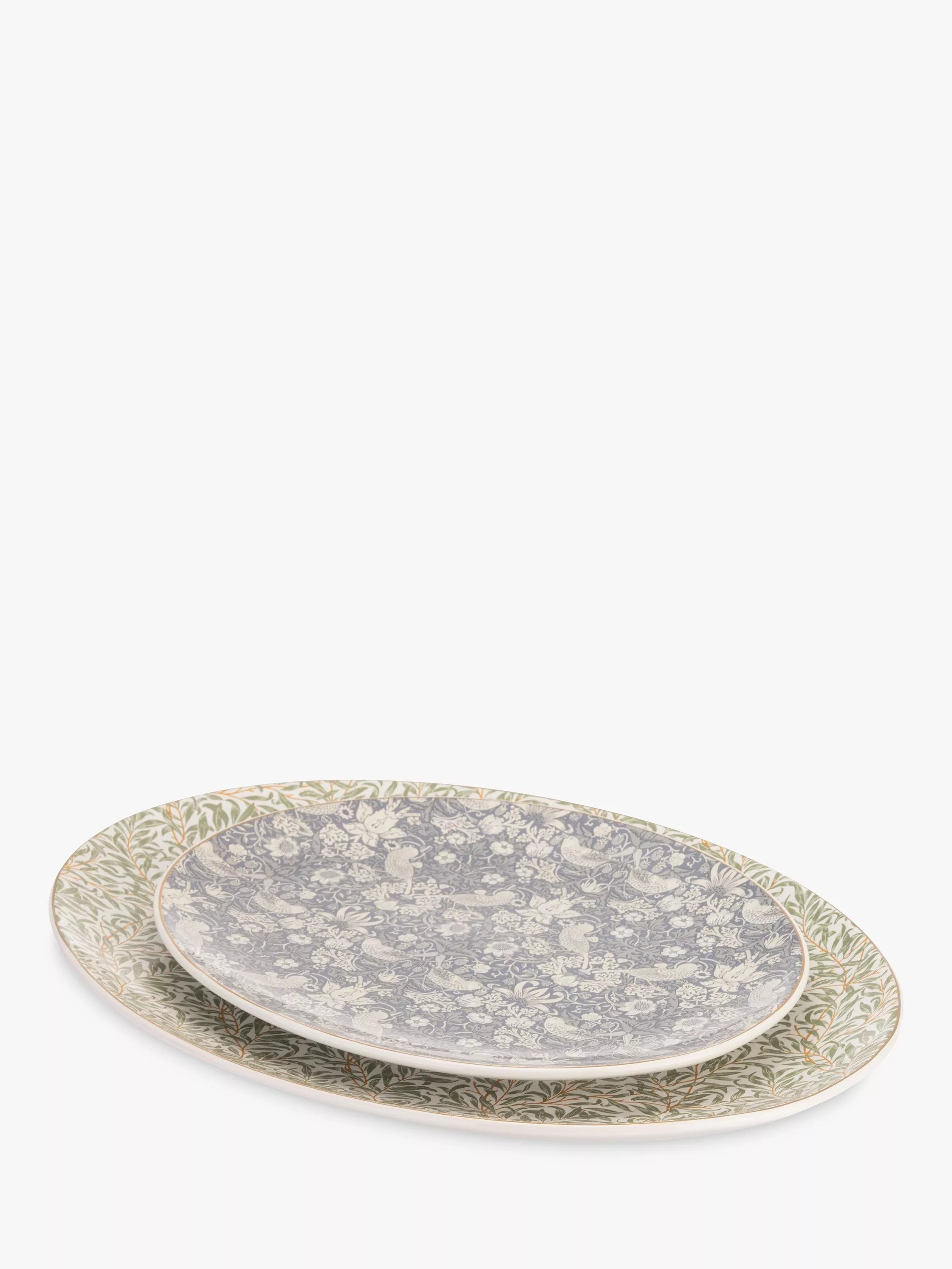 Two oval serving platters designed in two different William Morris prints. Made from durable stoneware, this elegant duo is great for everyday use or for special occasions. Dishwasher-safe for easy cleaning.