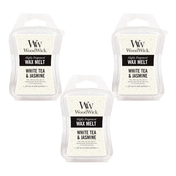 woodwick wax melt in white tea jasmine 227g combines the delicate fragrance of jasmine with the calming essence of white tea creating a soothing floral scent that brings tranquility and elegance to any room