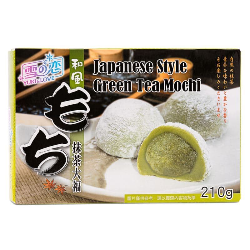 The brand Yuki & Love means \happiness and love\, which they say stands for bringing more light into each moment. It\u2019s a very popular Taiwanese brand that is loved for its range of desserts and snacks. Mochi are a traditional Japanese dessert made from a short grain Japonica glutinous rice, and typically other ingredients such as water, sugar, and cornstarch. The steamed rice is pounded into paste and molded into the desired shape. They have a light, stretchy consistency and are often filled with a sweet paste or jam in the centre. Yuki & Love's Japanese Style Green Tea Mochi are filled with a bittersweet paste flavoured with green tea. They are light, fluffy, chewy, and full of delicious green tea flavour.