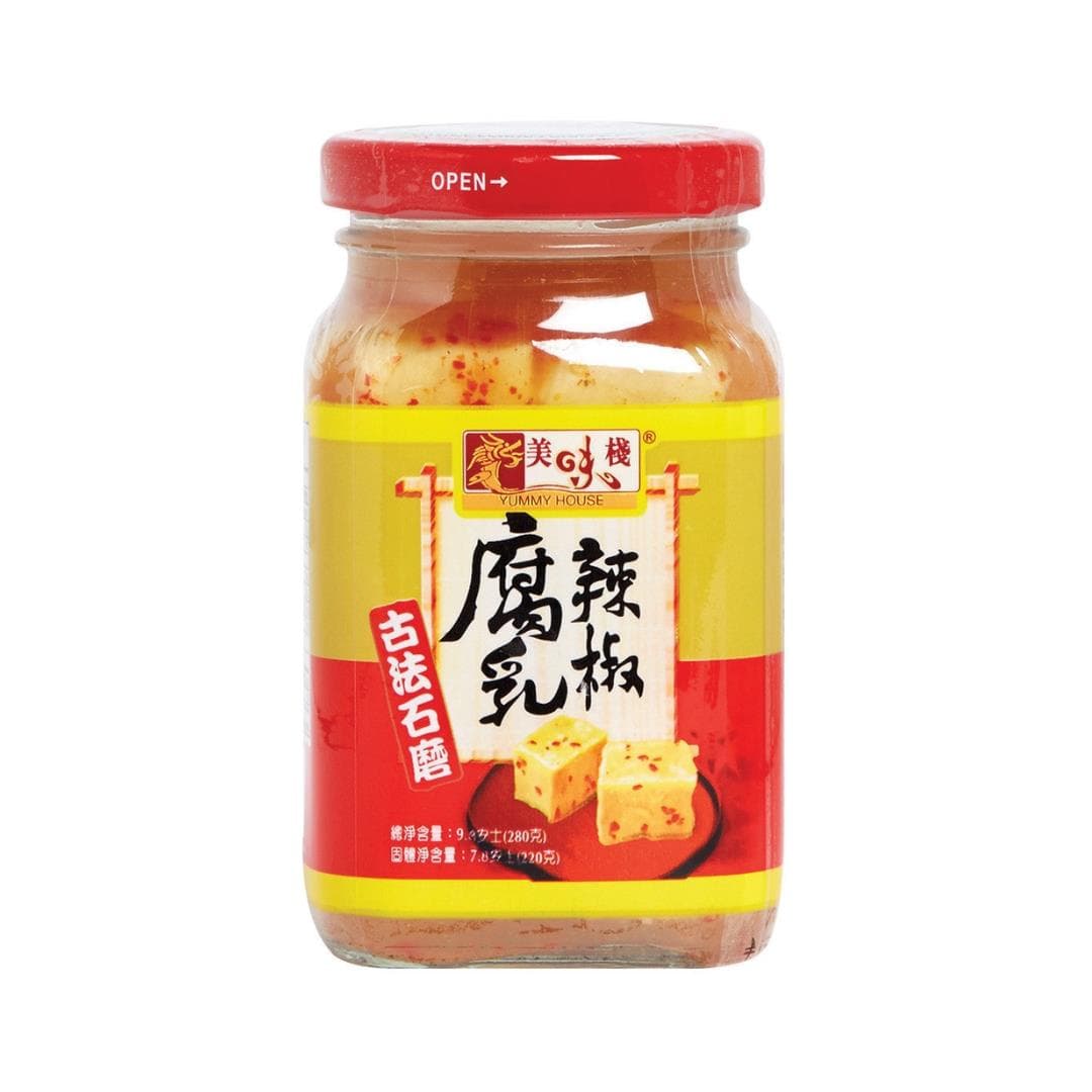 Yummy House Fermented Beancurd (Chilli) is a bold and flavourful variation of the classic Chinese condiment. Made from fermented tofu cubes and infused with a spicy chilli brine, it offers a creamy texture combined with a fiery kick that tantalises the palate. \n\n