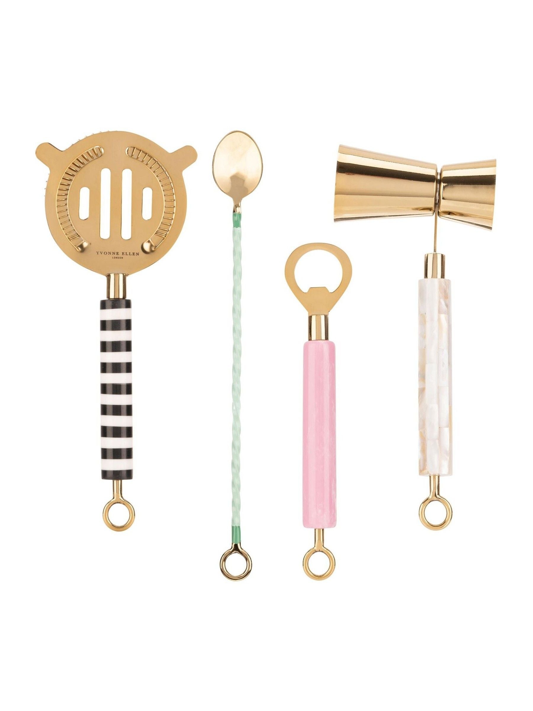 Get ready to shake, stir, and shine with Yvonne Ellen s Bar Tool Set! This giftable set features four fab finishes including marble and mother of pearl, complemented by bright colours and dazzling gold-coloured accents. Complete with a double jigger, long-handled bar spoon, strainer, and bottle opener, it's all you need for mixing magic!
