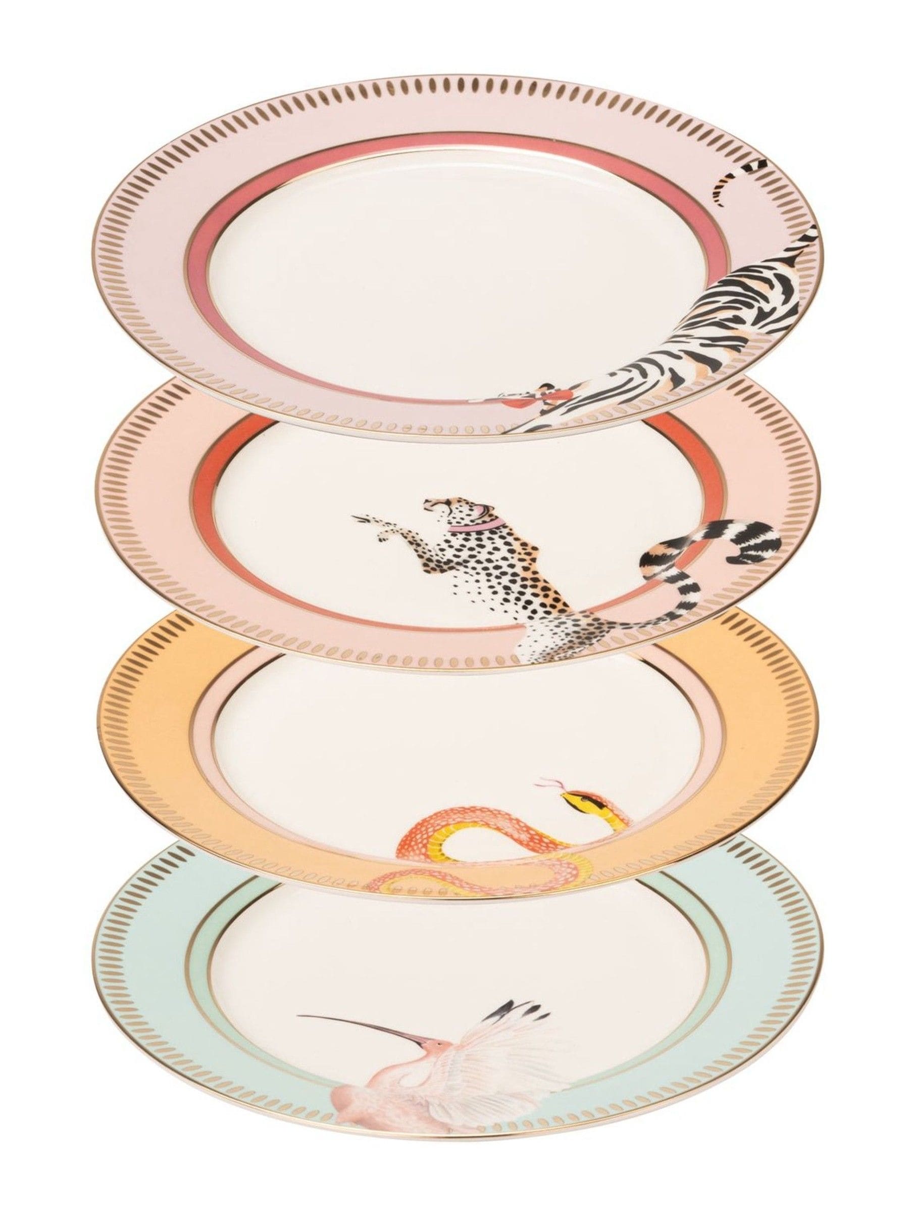 Add a playful twist to your tableware with the Yvonne Ellen set of 4 animal side plates. Featuring overlapping animal designs, tiger, bird, snakey, and cheetah, these plates perfectly match the Yvonne Ellen dinner plates, cereal bowls, and pasta bowls for a coordinated table setting. Finished with metallic gold coloured rim and edge detailing, this set comes beautifully packaged in a premium gift box, making it the perfect gift or addition to your collection.